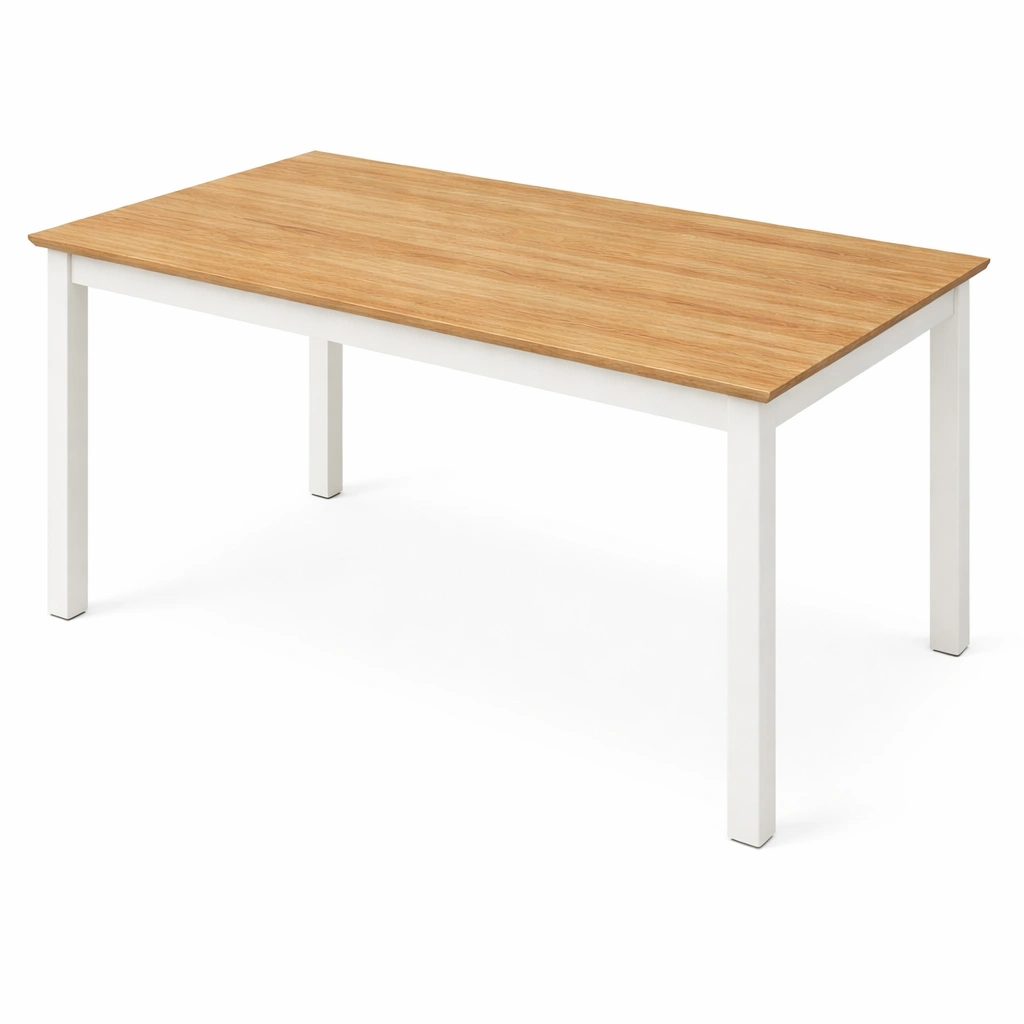 Materiales: Superficie de MDF con apariencia de roble; patas de acero pintado en blanco