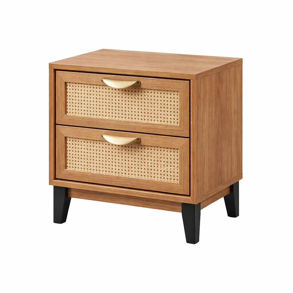 Materiales: Estructura de madera contrachapada, frente de cajones de ratán natural, patas de metal.